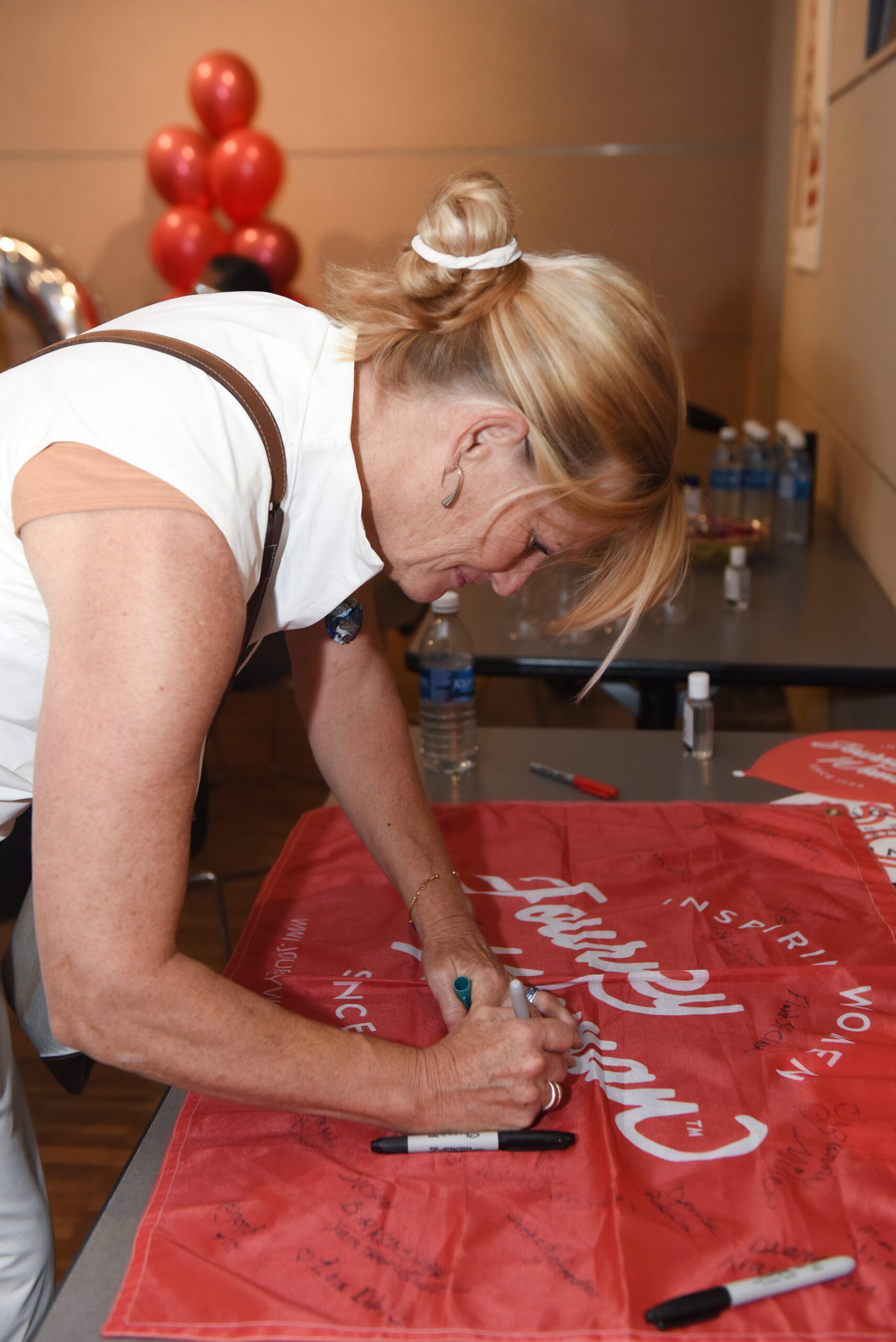 Libby Wildman signing the JourneyWoman flag/ Photo credit Camilla Pucholt