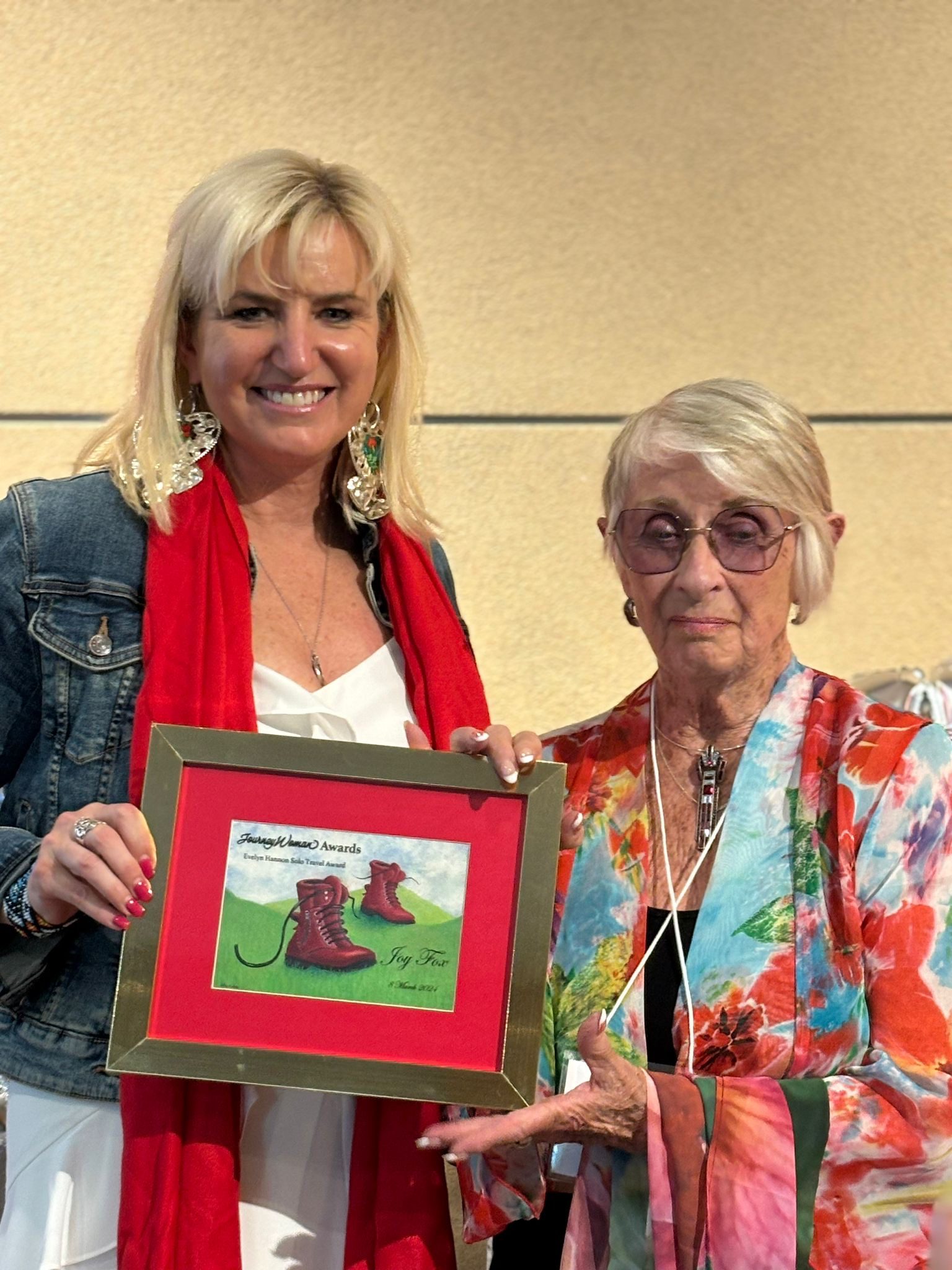 Carolyn Ray presenting Joy Fox with the JourneyWoman Evelyn Hannon Solo Travel Award, designed by Brenda McCrank/ Photo credit Camilla Pucholt