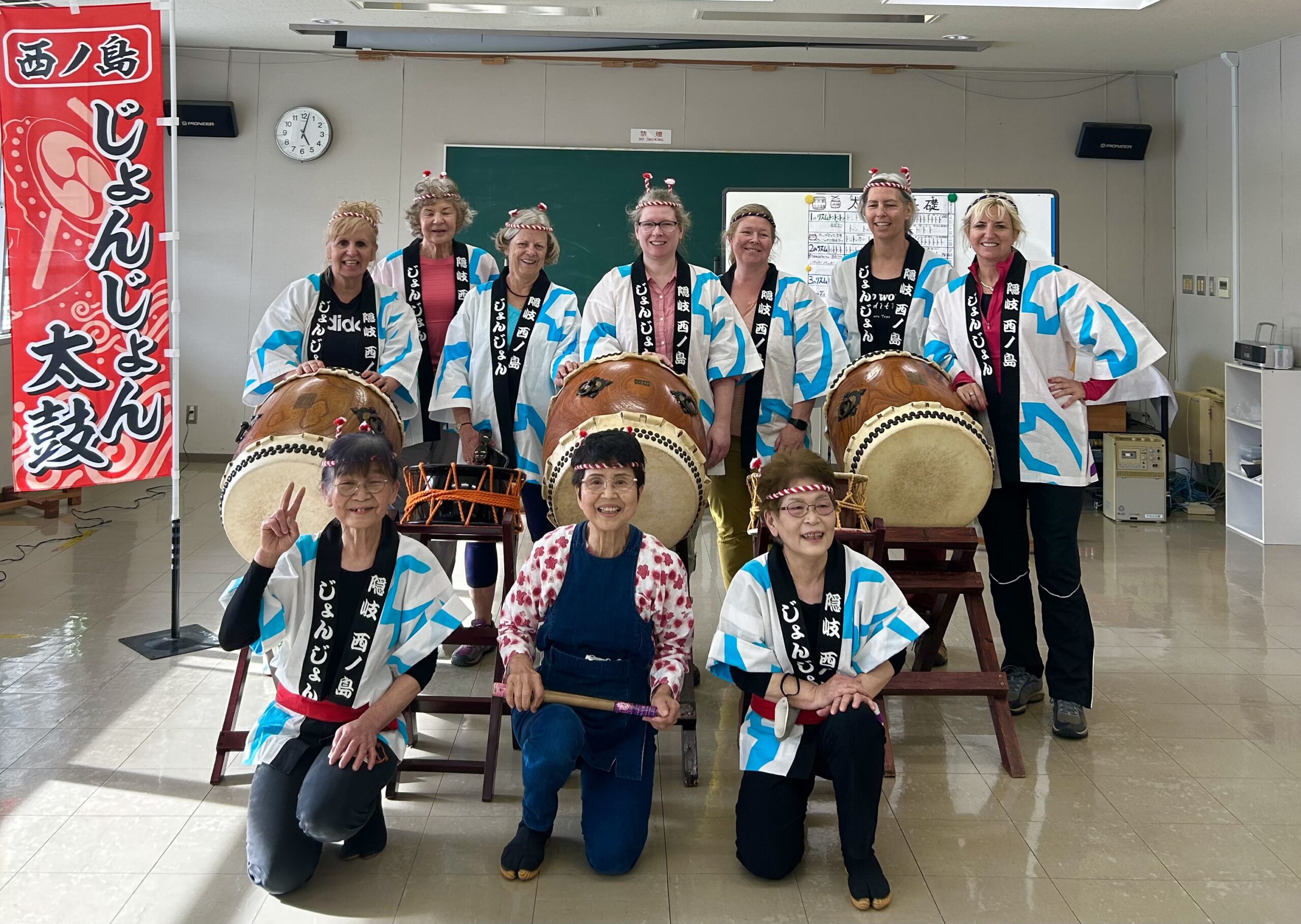 Our small group (Diana, Alexis, Joanne, Susan, Jennifer, Cline and Carolyn) with the female drummers on the Oki Islands.