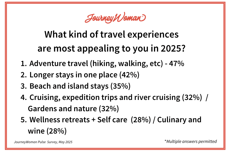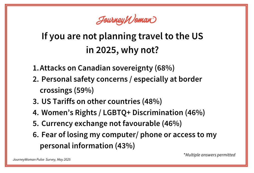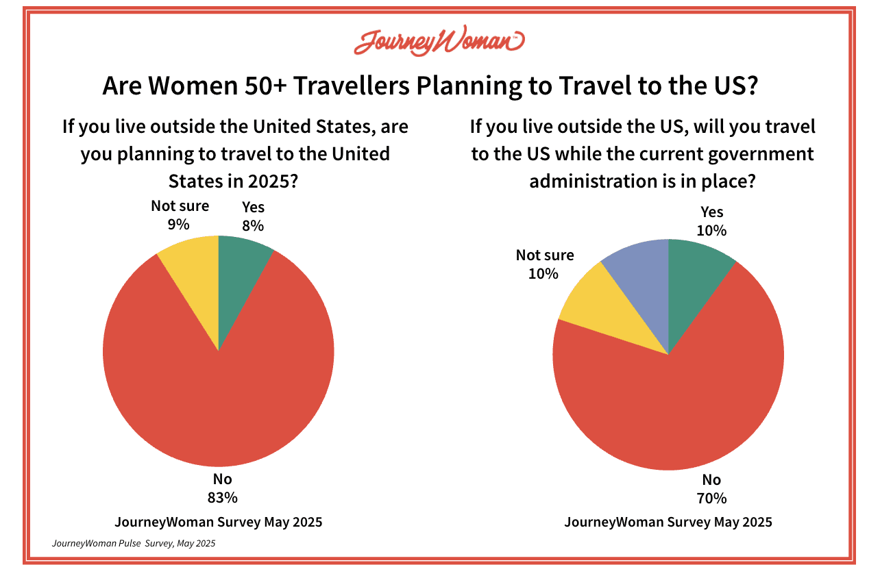 Politics is influencing travel decisions among women, the most important decision makers in travel, according to JourneyWoman’s Women 50+ Travel Pulse Survey. Conducted over a 48-hour period from May 2-4, 2025, women 50+ say that while most (64%) are travelling internationally, they have shifted their travel plans from the U.S. to other countries, including Canada, Western Europe and the United Kingdom. Among women surveyed, 84 per cent say they are not planning travel to the U.S in 2025 and 70 per cent say they will not come to the U.S. while the current administration is in office. Only 4 per cent of Americans who have travelled outside the U.S. said they experienced any negative issues or treatment.