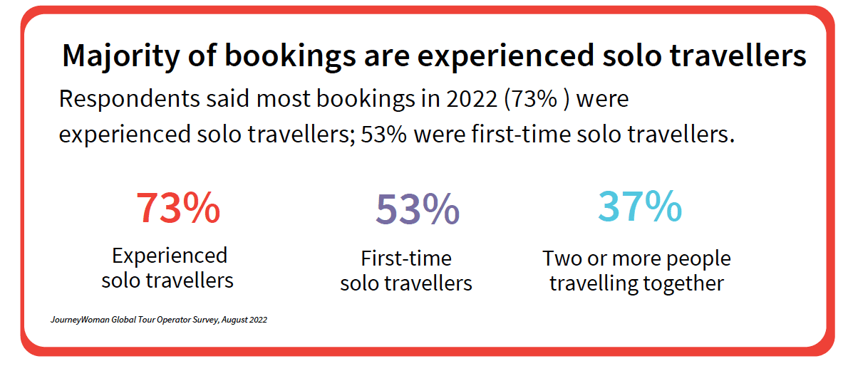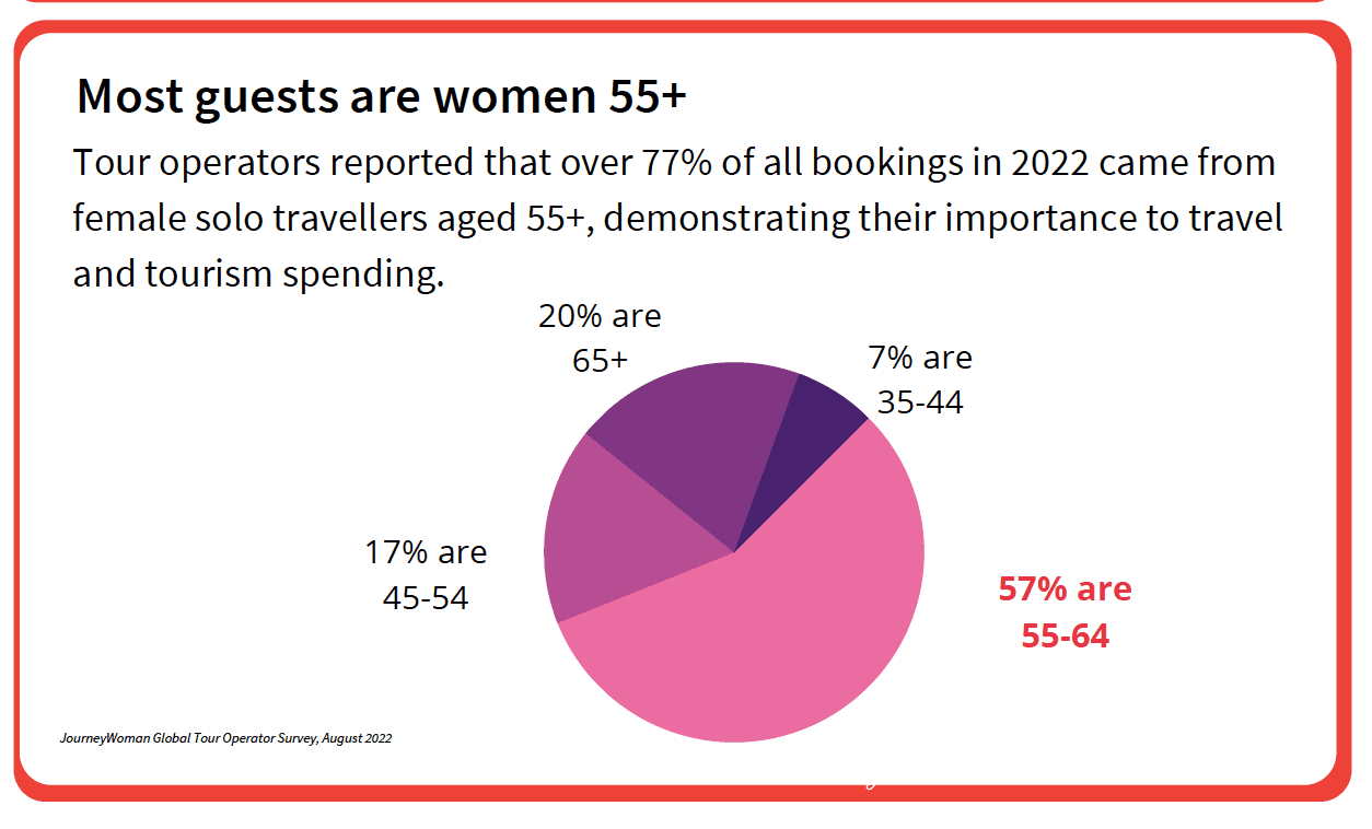 The survey, conducted among JourneyWoman’s global tour operator network in mid-August, shows that over 77% of all bookings in 2022 came from female solo travellers age 55+. Respondents noted that 73% of guests were experienced solo travellers and 53% were first-time solo travellers.