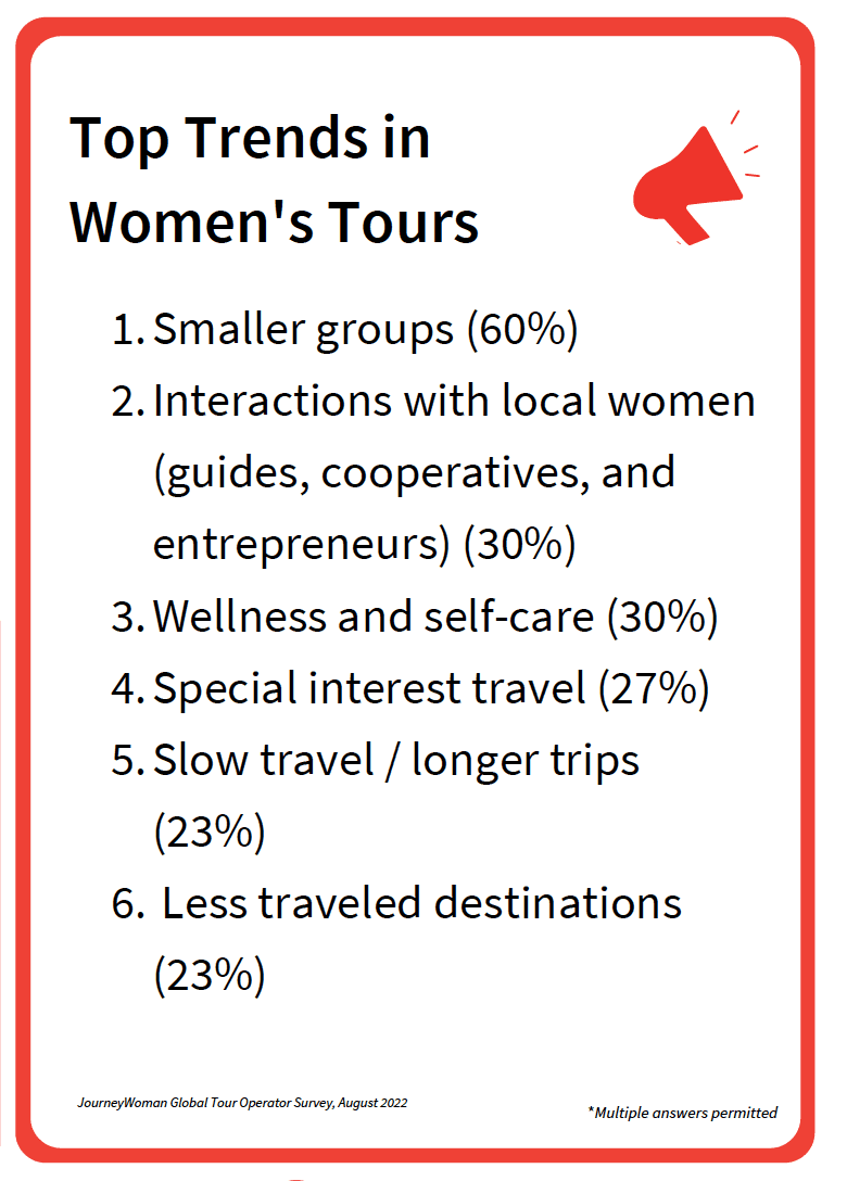 Group travel is often the first step for new solo travellers seeking safe, customized experiences designed by women who understand their unique needs. More than 83% of respondents offer women-only groups, and 60% cite a growing trend to smaller groups.