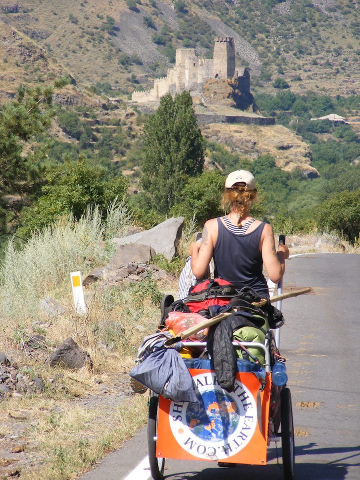 Featured image: Angela with her cart in front of a fortress | Photo provided by Angela Maxwell