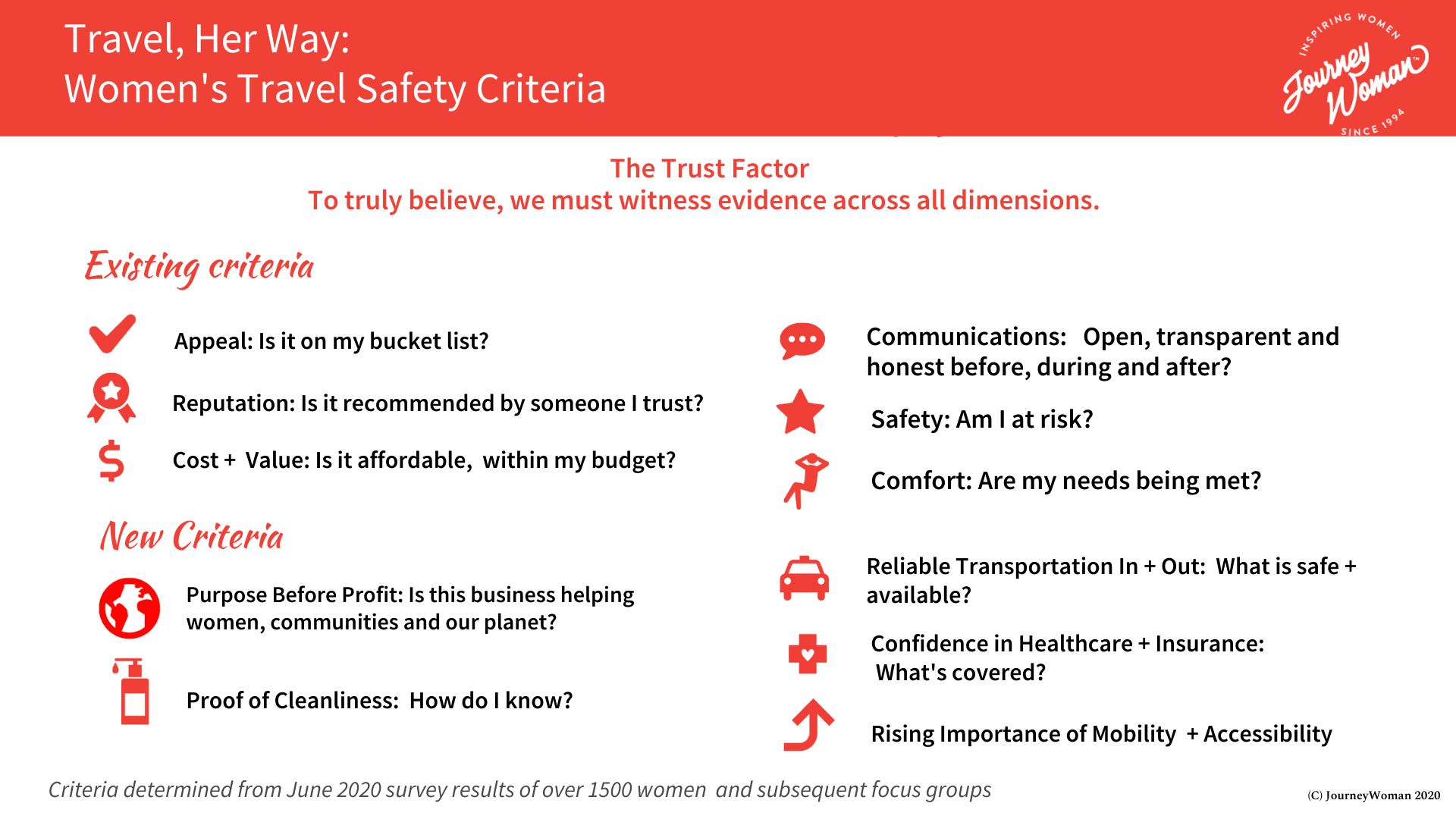 There is no question that travel is going to be different than it was before the pandemic. We are dealing with many complexities, both known and unknown. In June, to better understand the impact of the pandemic on women’s travel, we conducted an online study called “Embracing the Unknown: The Risk and Reward of Travel”, which many in the JourneyWoman community participated in. Over 1,500 well-travelled and highly experienced women age 55+ shared their views on decision-making criteria, reputation and trust, and destination choice. We published these findings in July, in “Why Women Will Save Travel”. Based on this research and our #travelathome road trips this summer, we’re thinking about what the future looks like for mature, independent women travellers.